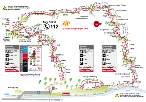 AnsehenVielseitiges Klettersteiggebiet mit Routen von A bis E – zahlreiche Kombinationen möglich, mit Highlights wie Seilbrücken, Kaminpassagen und Panoramablicken.