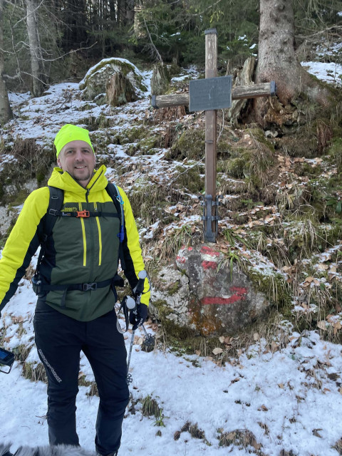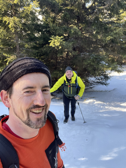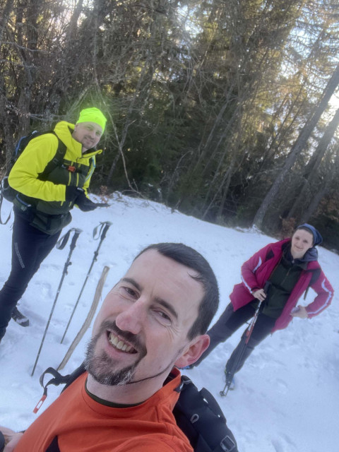 AnsehenWinterliche Bergtour von Waidisch aufs Ferlacher Horn – stetiger Aufstieg durch verschneiten Wald mit herrlichem Blick über das Rosental und die Karawanken.