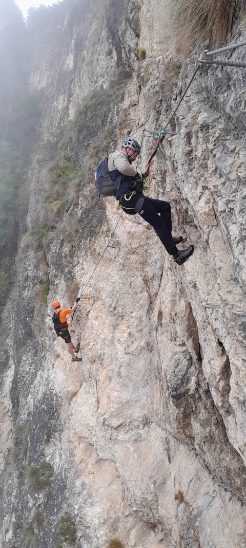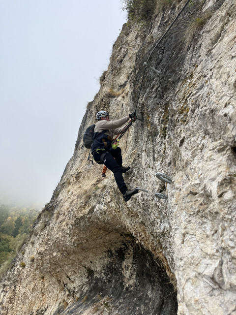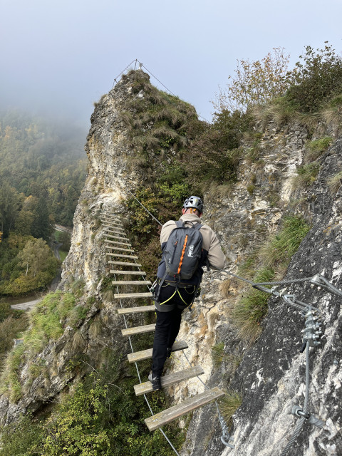 Durchgehendes Stahlseil, schmale Trittbügel an den schwierigsten Stellen, Hängebrücke, einzelne Bohrhaken zum Nachsichern