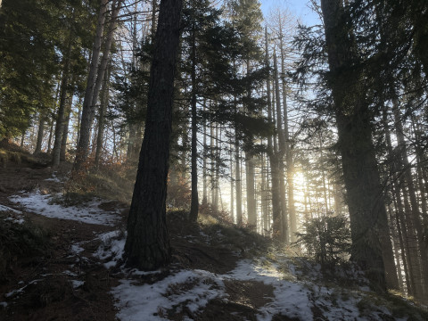 AnsehenWinterliche Bergtour von Waidisch aufs Ferlacher Horn – stetiger Aufstieg durch verschneiten Wald mit herrlichem Blick über das Rosental und die Karawanken.